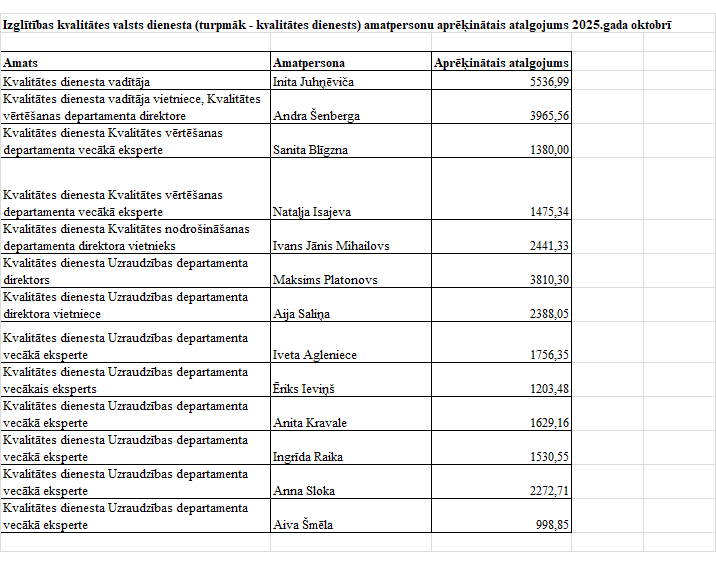 Izglītības kvalitātes valsts dienesta amatpersonu atalgojums 2025. gada oktobrī