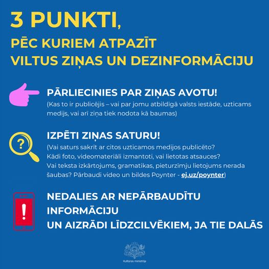 - Kultūras ministrijas sagatavoto vizuāli par to kā atpazīt viltus ziņas. Aicinām kritiski izvērtēt informāciju sociālajos medijos - bailēs, dusmās un arī neziņas apstākļos viegli vairoties viltus ziņām un dezinformācijai! Skatieties, klausieties un sekojiet uzticamiem un pārbaudītiem informācijas avotiem.