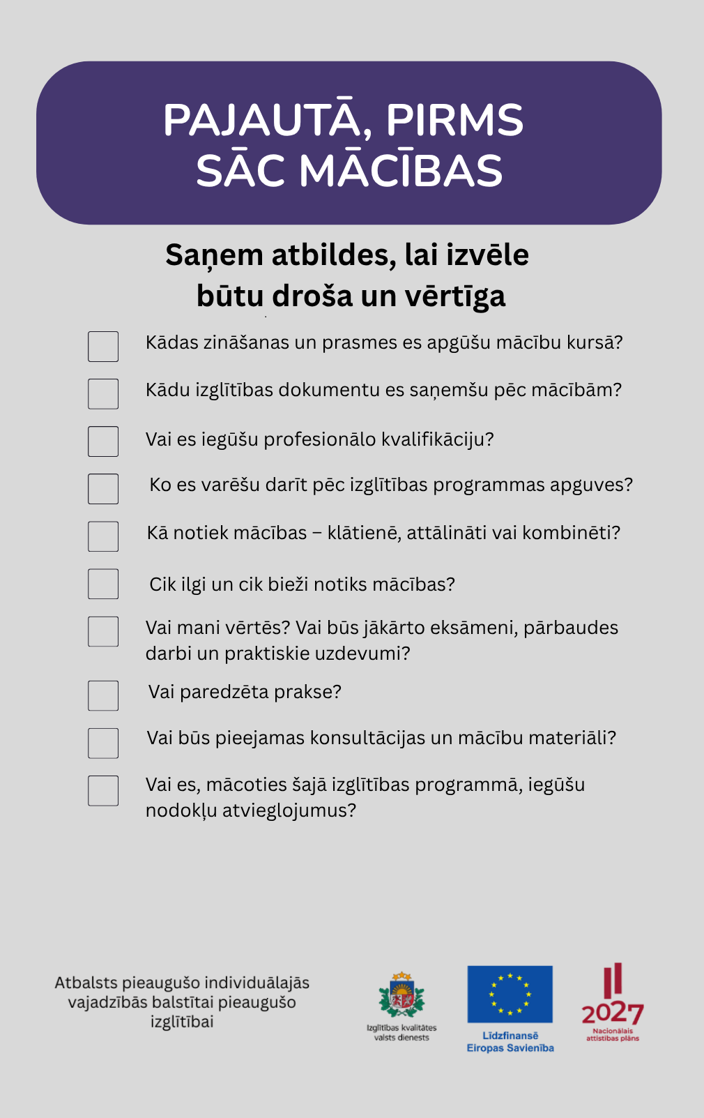 Izglītības kvalitātes valsts dienests aicina pirms pieteikšanās mācībām izvērtēt, vai konkrētā izglītības programma sniegs gaidīto rezultātu. Lai palīdzētu pieaugušajiem pieņemt pārdomātu lēmumu, ir sagatavots saraksts ar kontroljautājumiem, kas jānoskaidro, pirms mācību uzsākšanas.